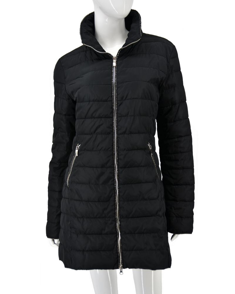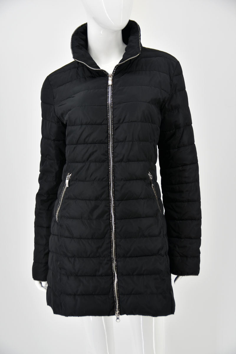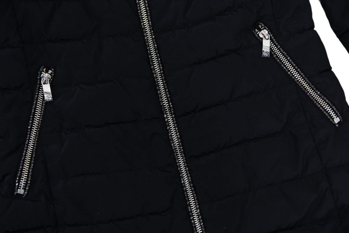 Płaszcz damski pikowany w kolorze czarnym. Elegancki. Brzegi wykończone ozdobnym srebrnym sznurkiem. Logo na ramieniu. Zapinany na dwubiegunowy zamek. Z kieszeniami. Wypełnienie syntetyczne. Ciepły i lekki.