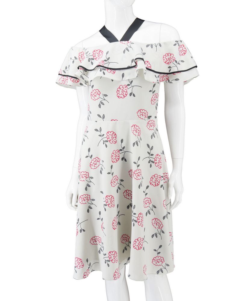 Szyfonowa sukienka z falbanką, ze wzorem w kwiaty, na podszewce, rozszerzana od pasa, zapinana z tyłu na suwak