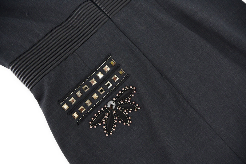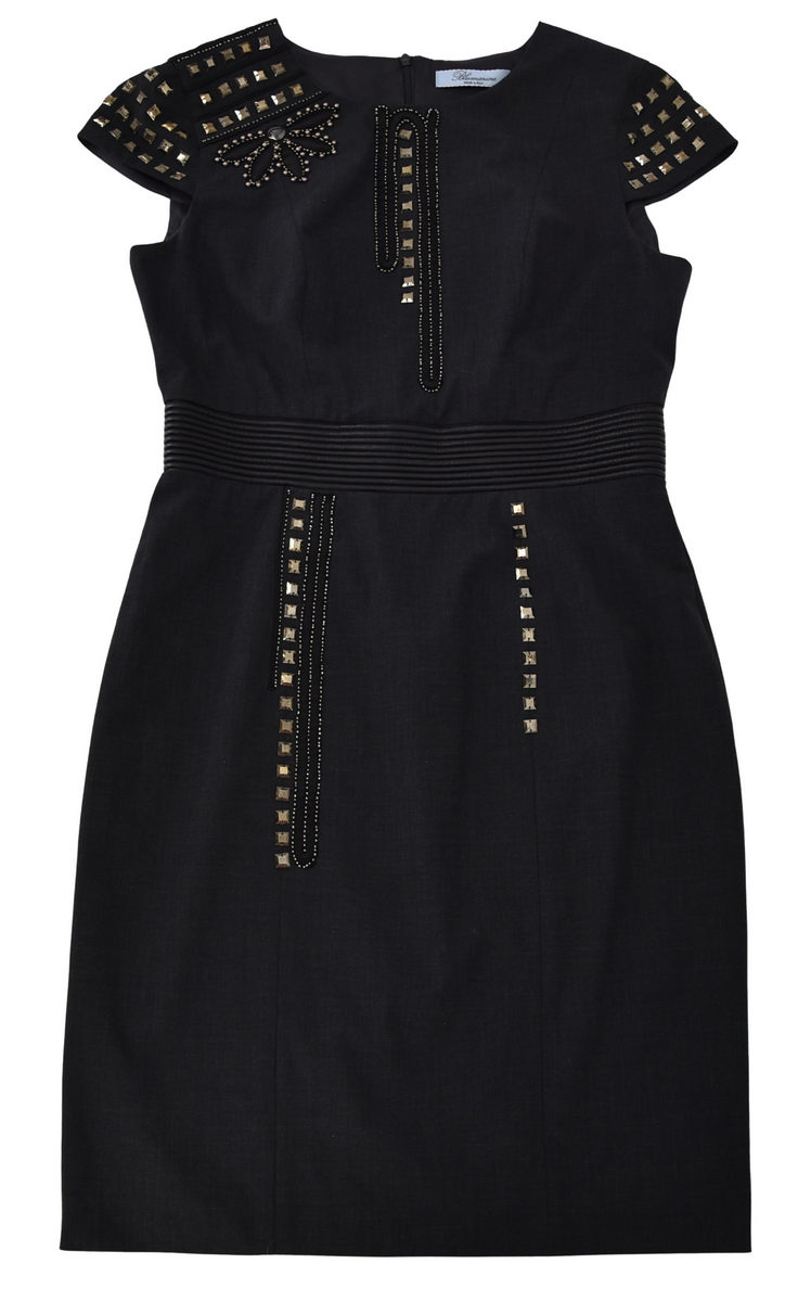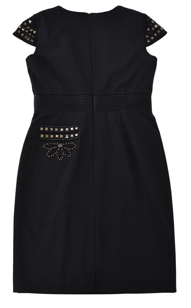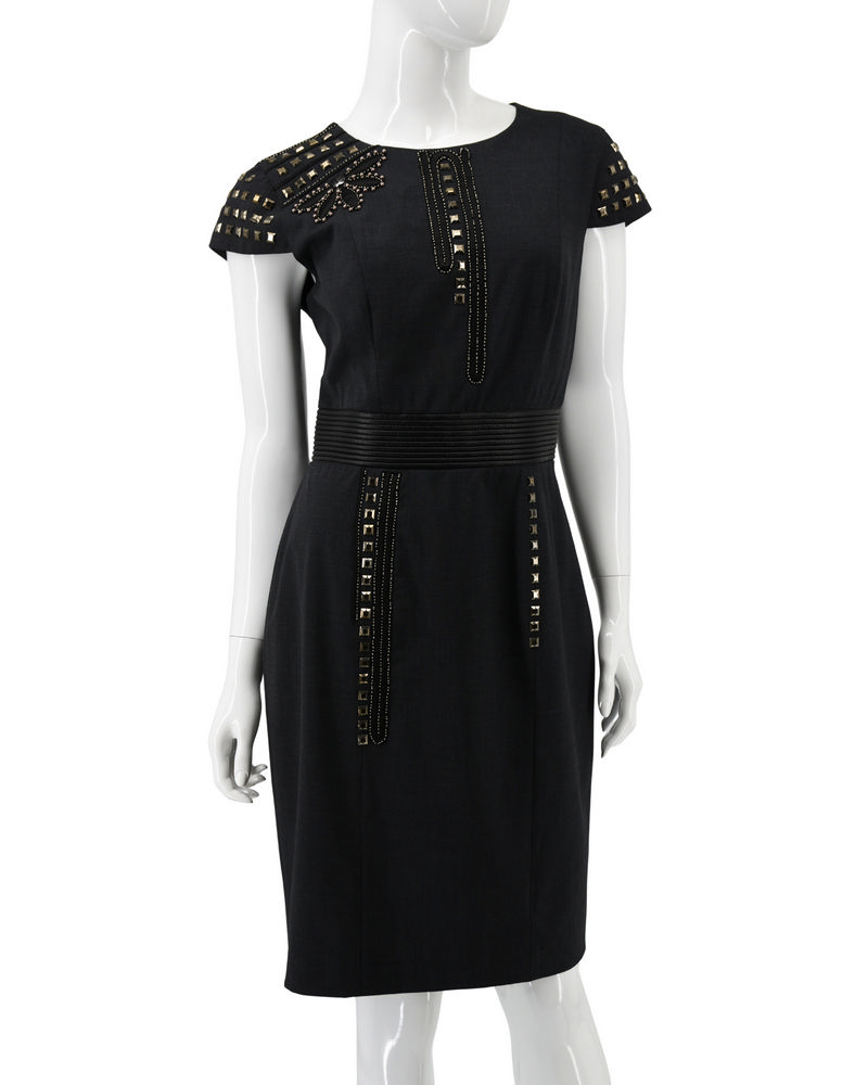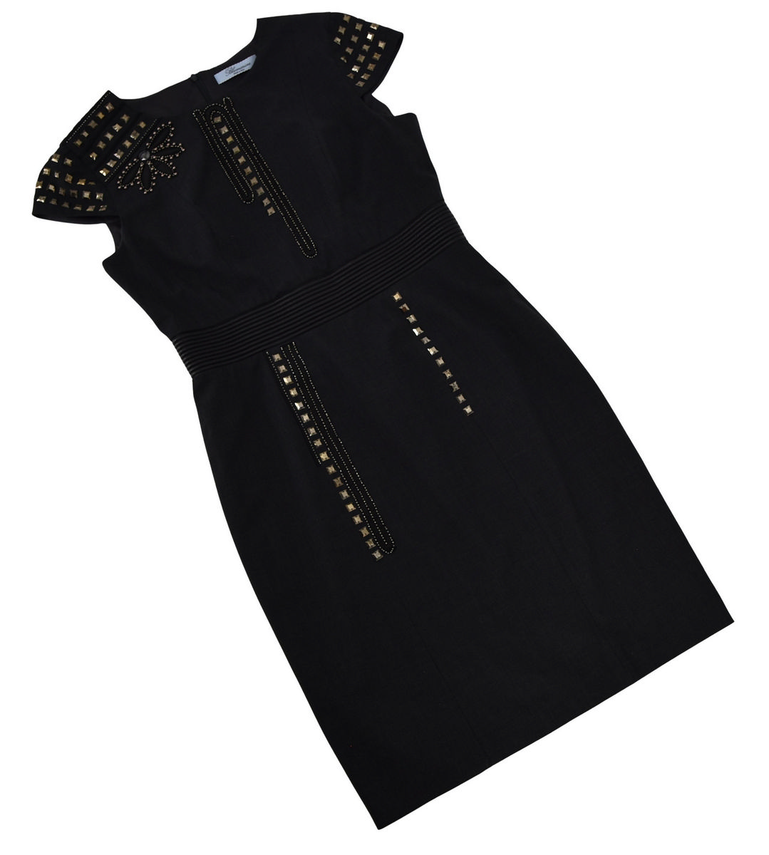 Elegancka sukienka o kroju ołówkowym z krótkim rękawem, wykonana z cienkiej wełny, zdobiona koralikami i dżetami. Bardzo elegancka, nadaje stylizacji nieco rockowy charakter. Dekolt okrągły. Pięknie układa się na sylwetce.