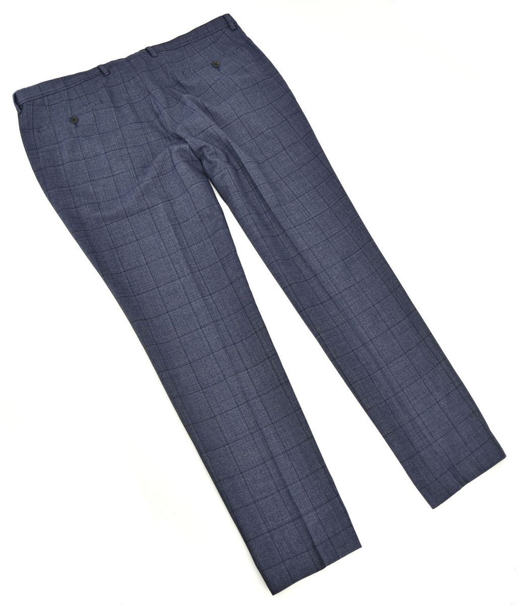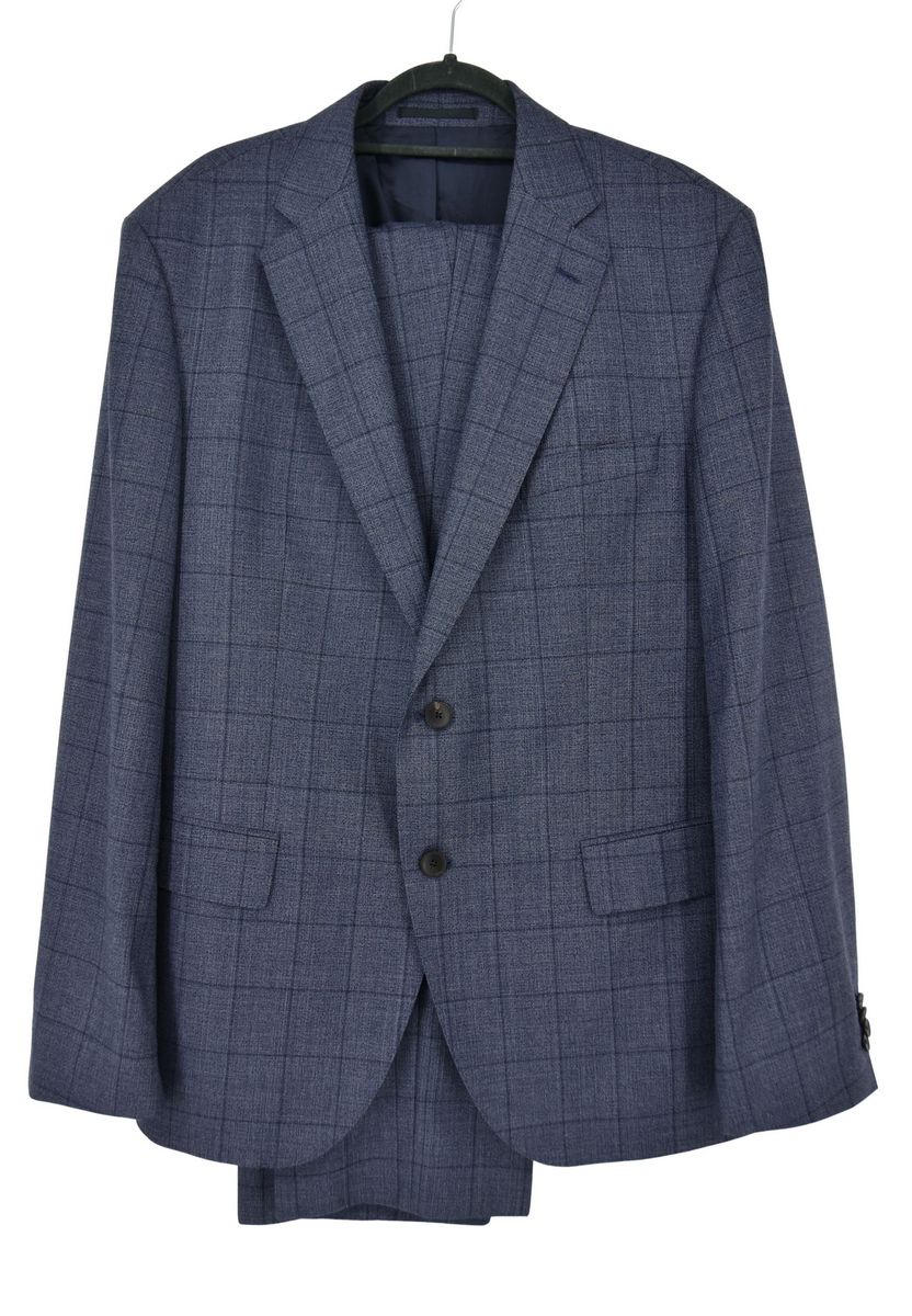 Odzież używana. Elegancki męski garnitur w kratę. Wykonany z wełny i jedwabiu. Idealny dla mężczyzny ceniącego klasykę i komfort. Kolorystyka w odcieniach niebieskiego