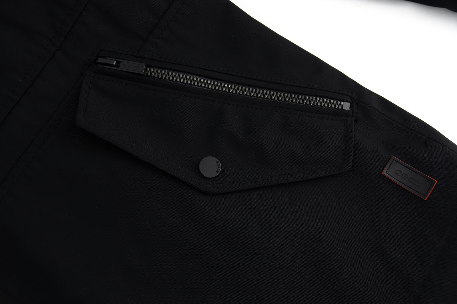 Posiada liczne kieszenie zewnętrzne i wewnątrz zapinane na suwak i napy. U dołu firmowa naszywka.