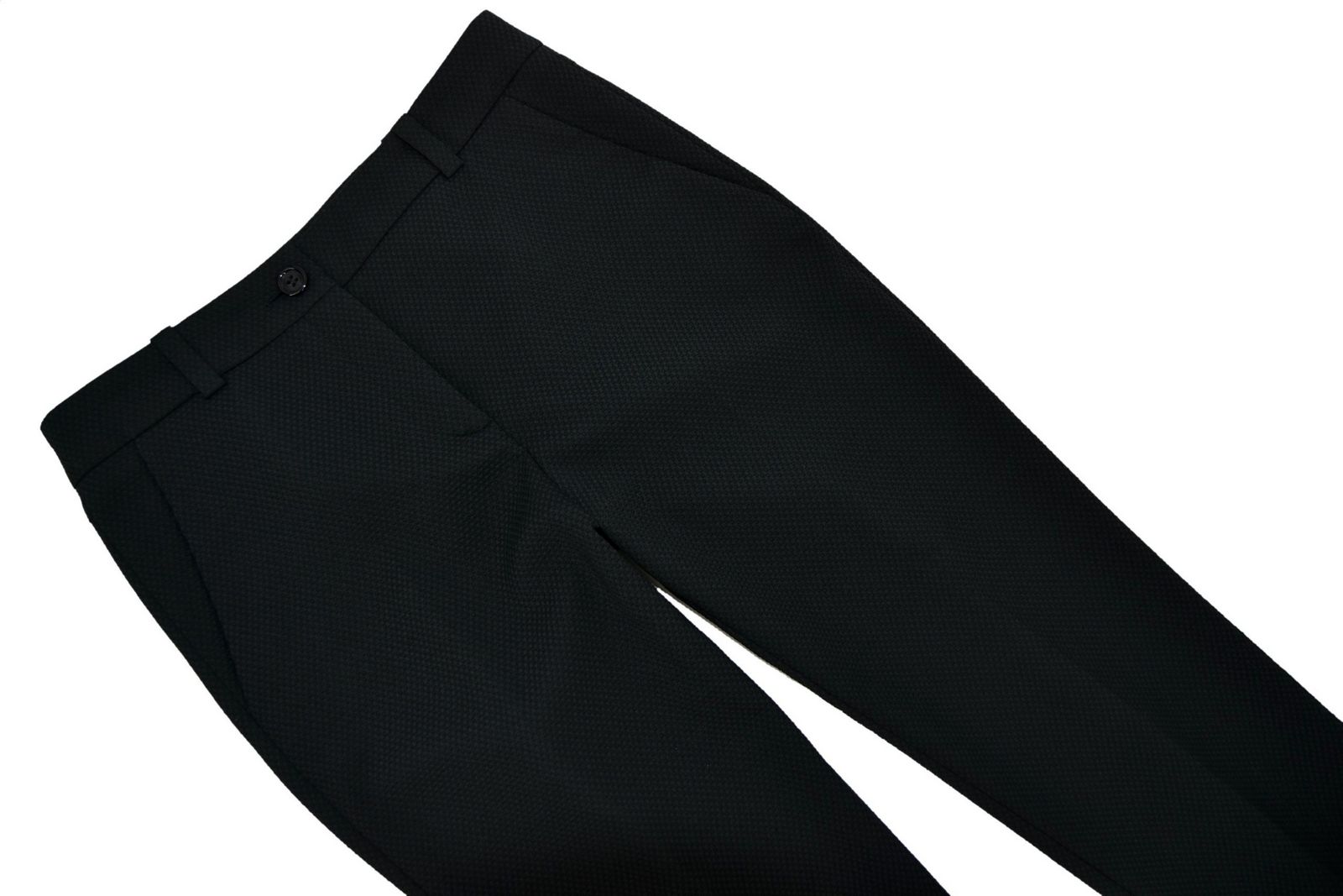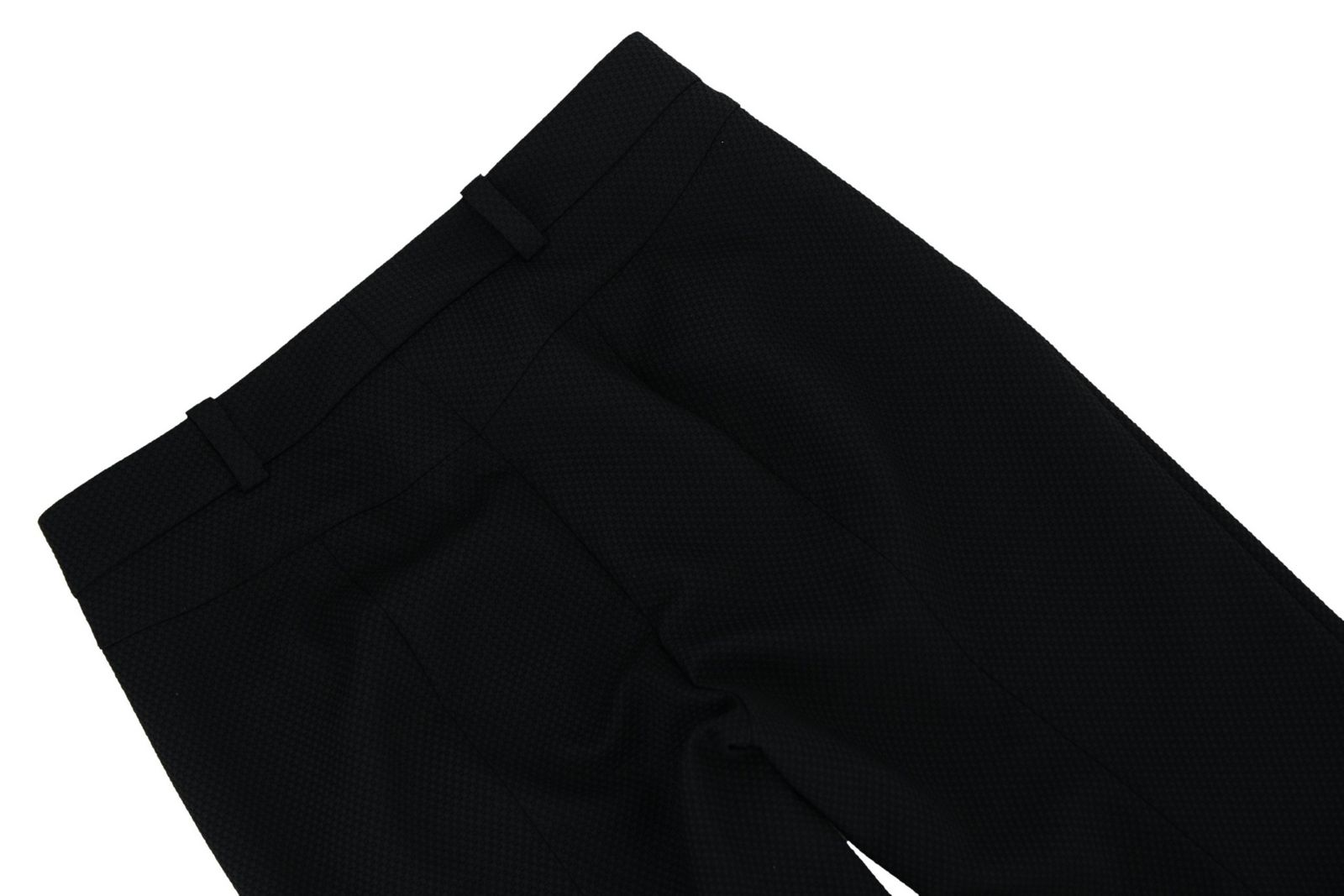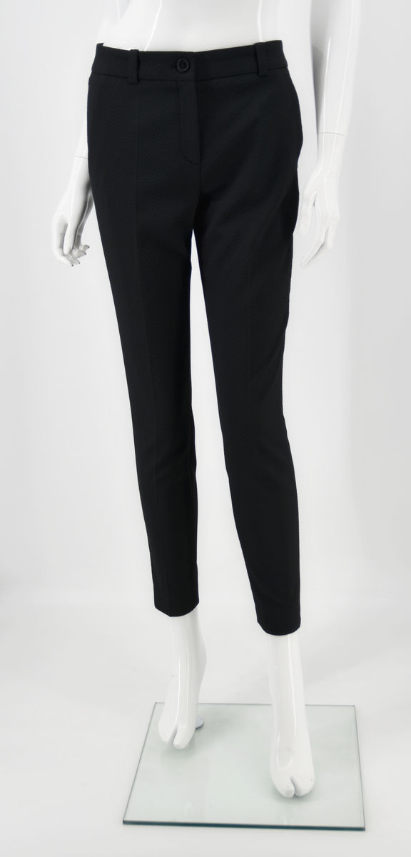 Eleganckie spodnie damskie w kolorze czarnym wykonane z teksturowanego materiału. Klasyczne, stylowe, pięknie się układają. Nogawki o prostym kroju, zaprasowane w kant. Po bokach kieszenie, w pasie szlufki na pasek. Zapinane na guzik i haftkę. Idealne do pracy i na formalne spotkania.
