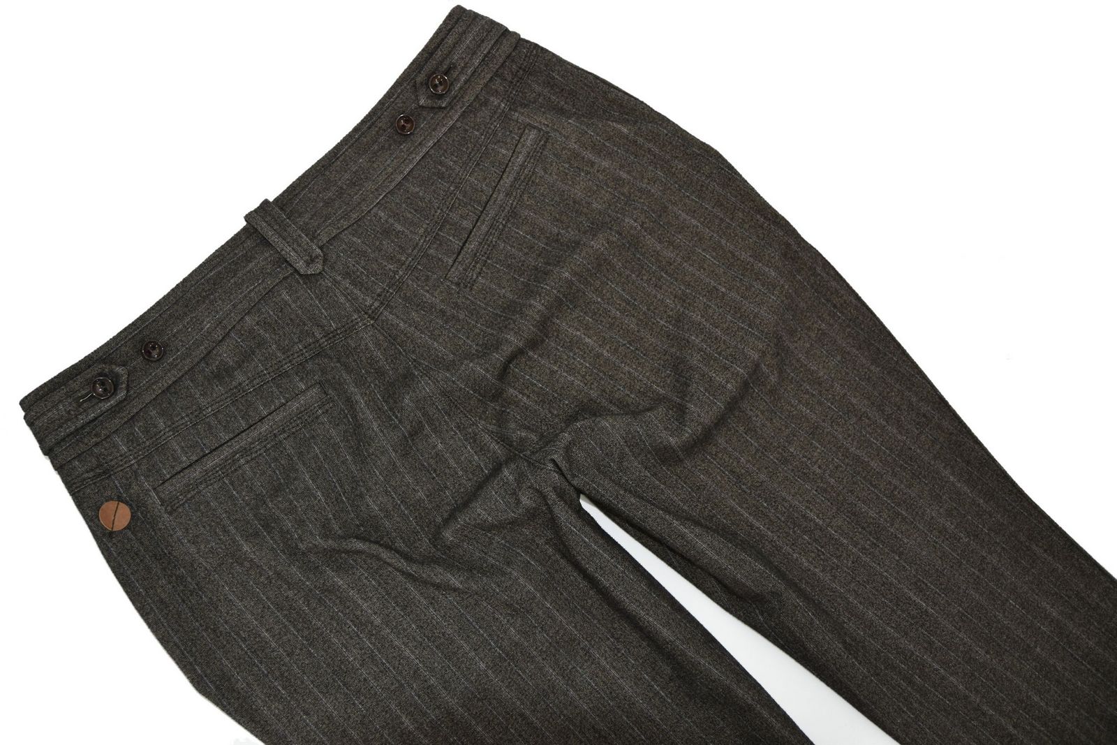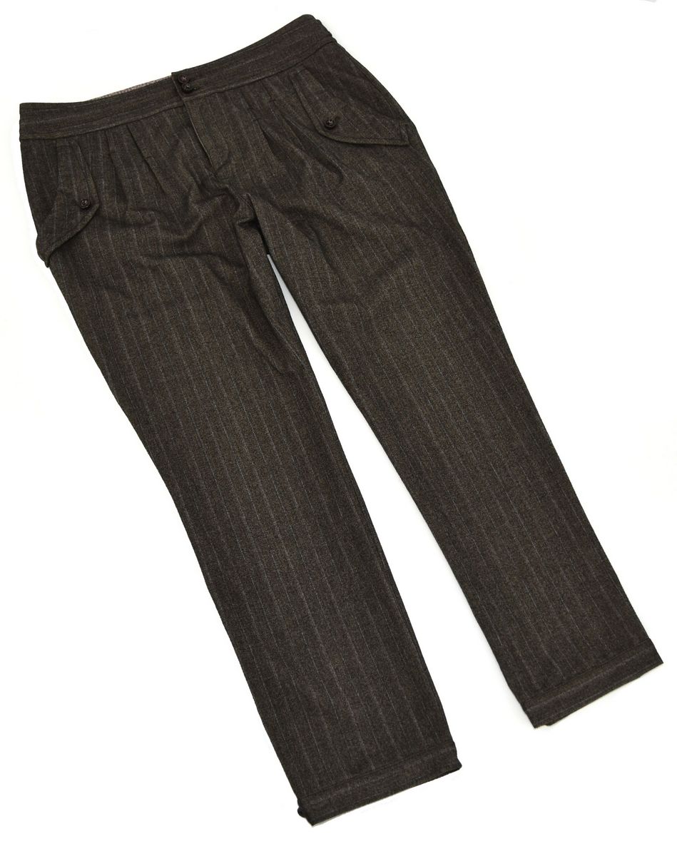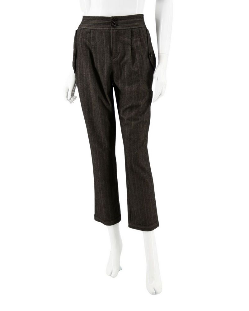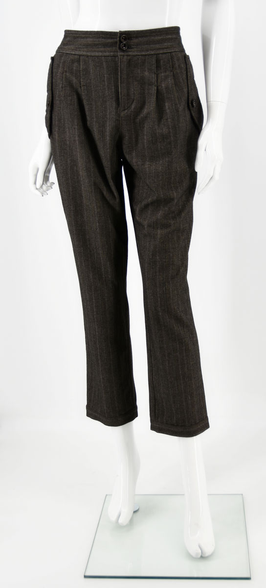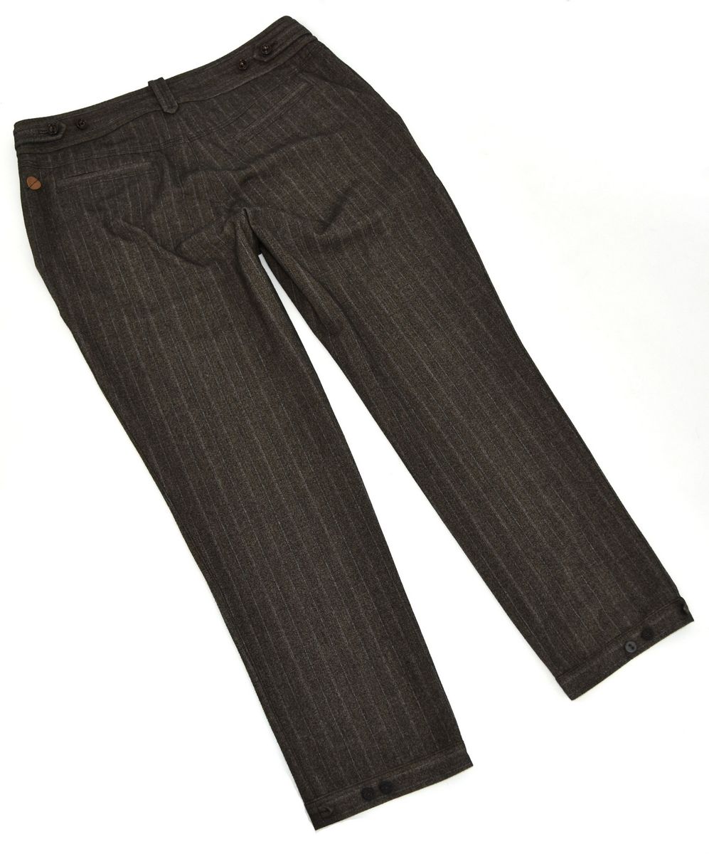 Spodnie damskie w odcieniu szaro-brązowym ze wzorem w prążek. W stylu vintage, z ozdobnymi zakładkami, pięknie się układają. Nogawki szerokie, zwężane ku dołowi