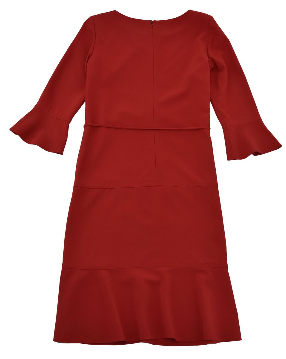 Elegancka damska sukienka w kolorze czerwonym. Długość midi. Rękawy 3/4 wykończone falbaną. Wiązana w talii. Na podszewce. Idealna na wieczorne wyjścia i specjalne okazje.