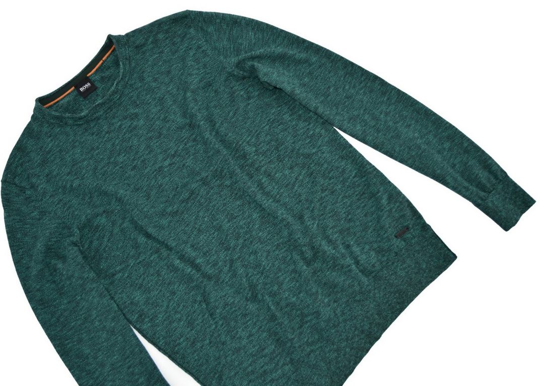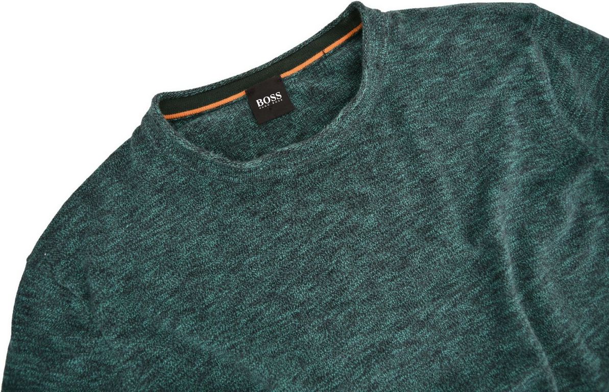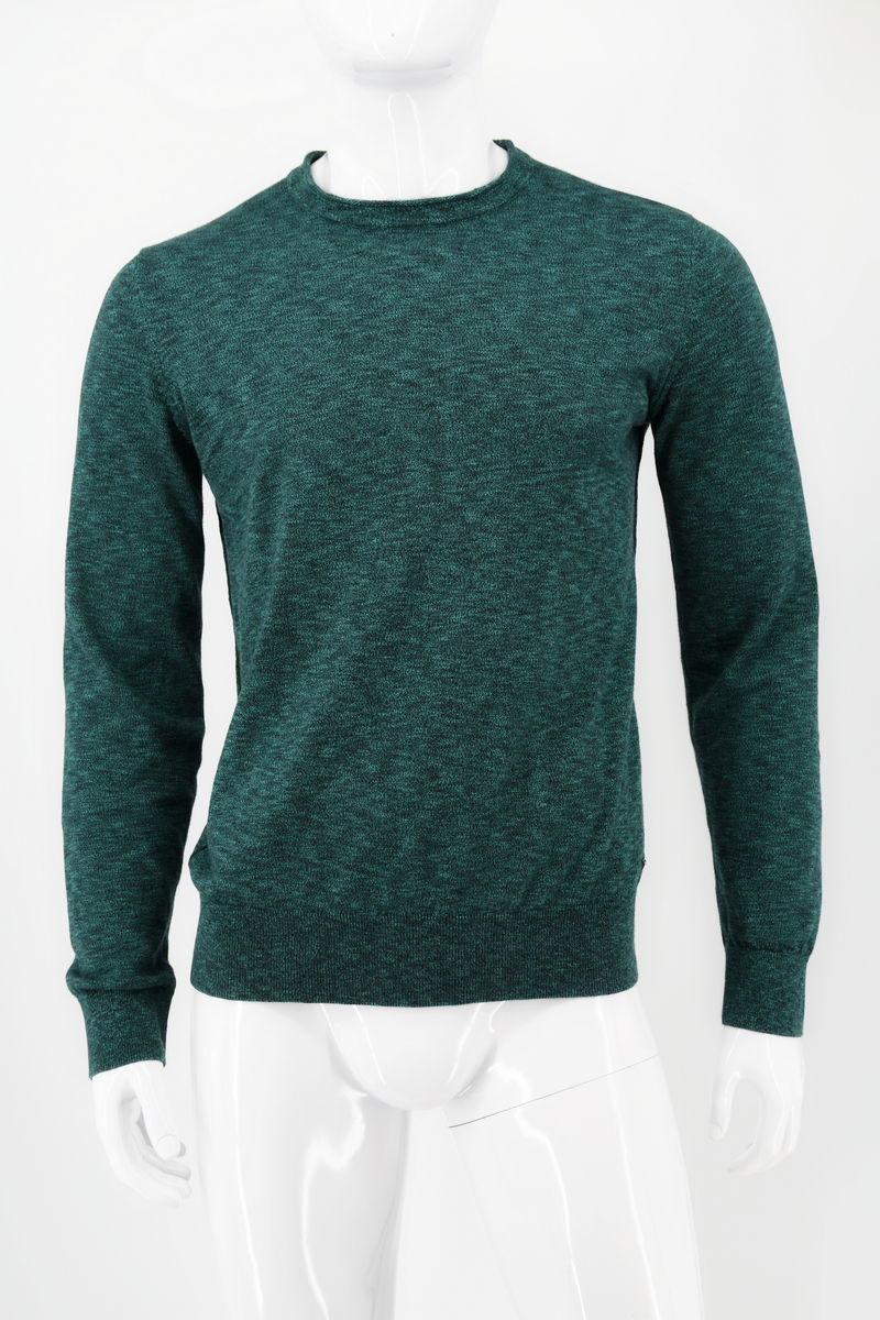 Stylowy sweter z wzorem melanż w zielonym odcieniu. Wykonany z najwyższej jakości bawełny. Miękki w dotyku, komfortowy. Na dole swetra firmowa blaszka. Idealny zarówno do codziennych jak i eleganckich stylizacji.