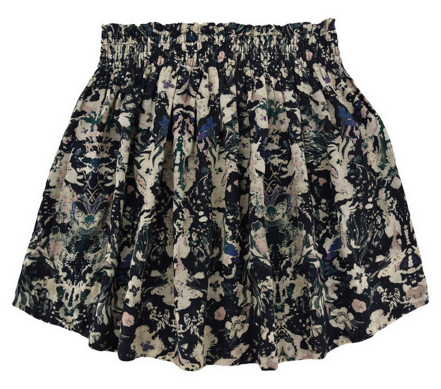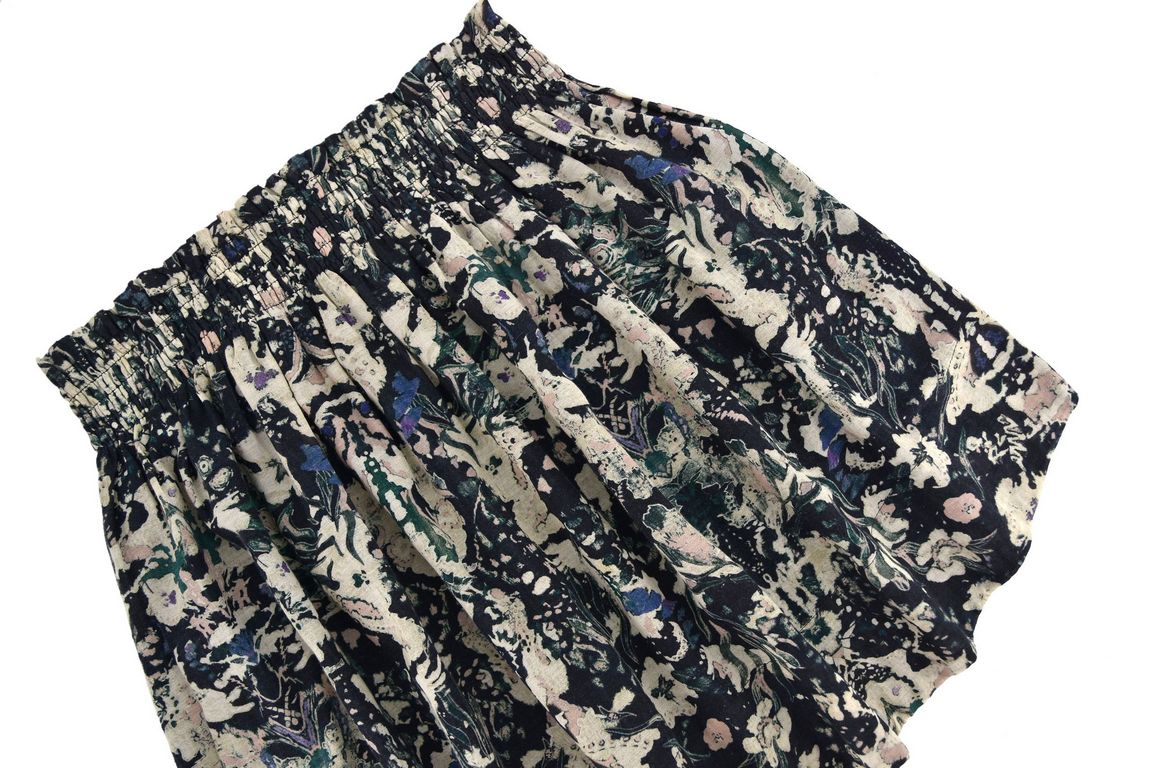 Piękna wzorzysta spódnica, rozkloszowana, z wysokim stanem. Krótka, do połowy uda. Z kieszeniami po bokach. W pasie guma. Na bawełnianej podszewce. Idealna do codziennych stylizacji.