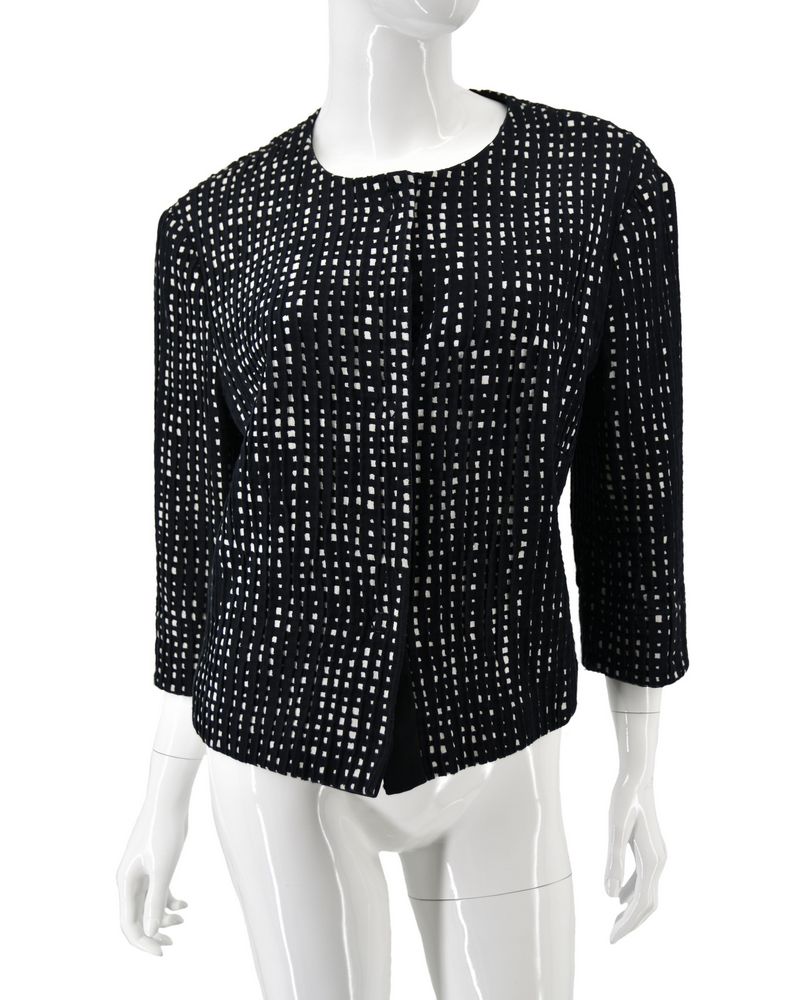 Przepiękny żakiet/bolerko z czarno-białym wzorem. Ciekawa struktura materiału, która układa się w zakładki. Klasyczny prosty fason. Rękawy 3/4. Zapinana na zatrzaski. Idealna do biura i na wiele formalnych okazji.