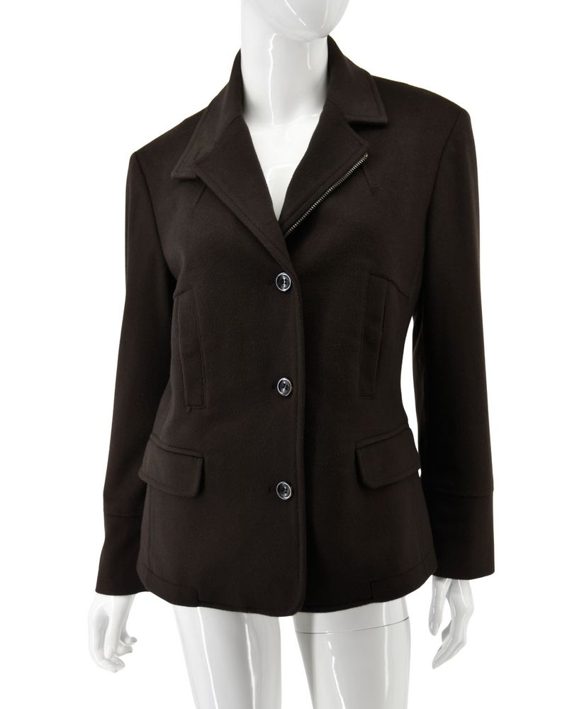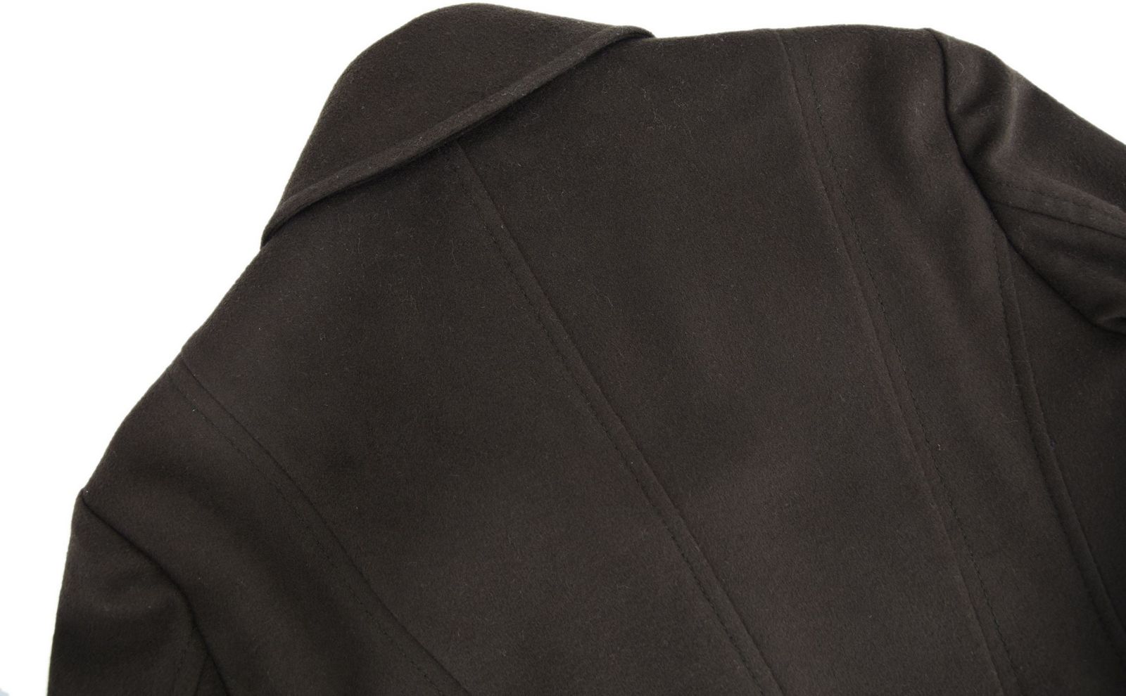 Płaszcz damski przejściowy w kolorze brązowym wykonany z miękkiej wełny. Długość do bioder.