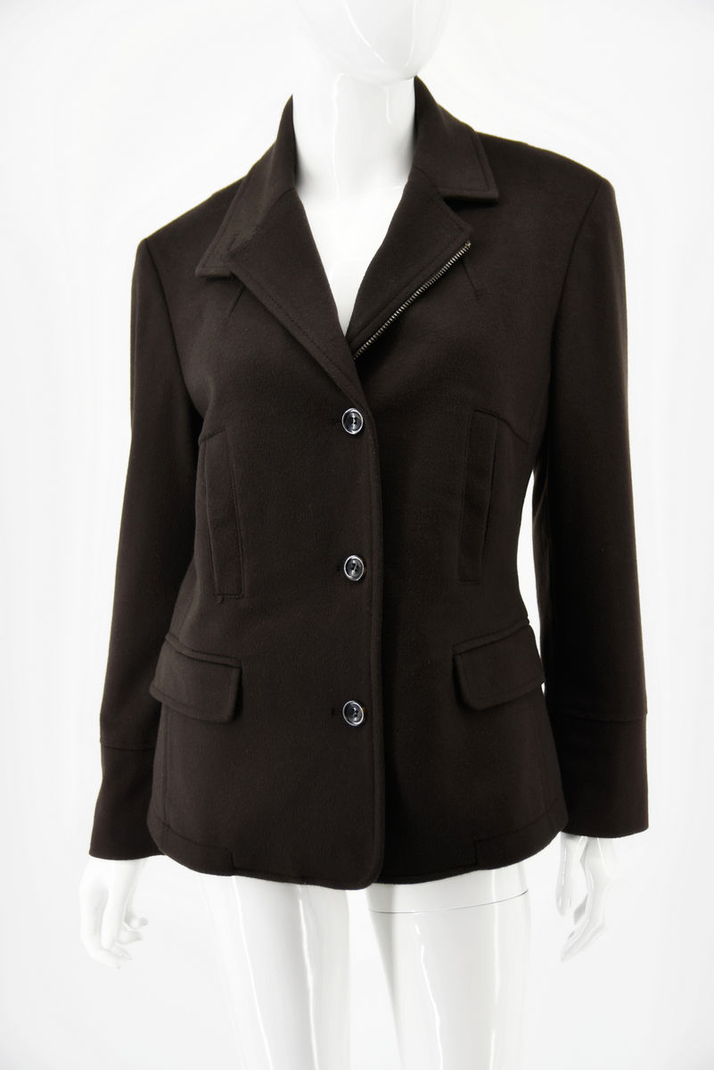 Zapinany na suwak i guziki. Posiada liczne kieszenie. W środku brązowa podszewka.