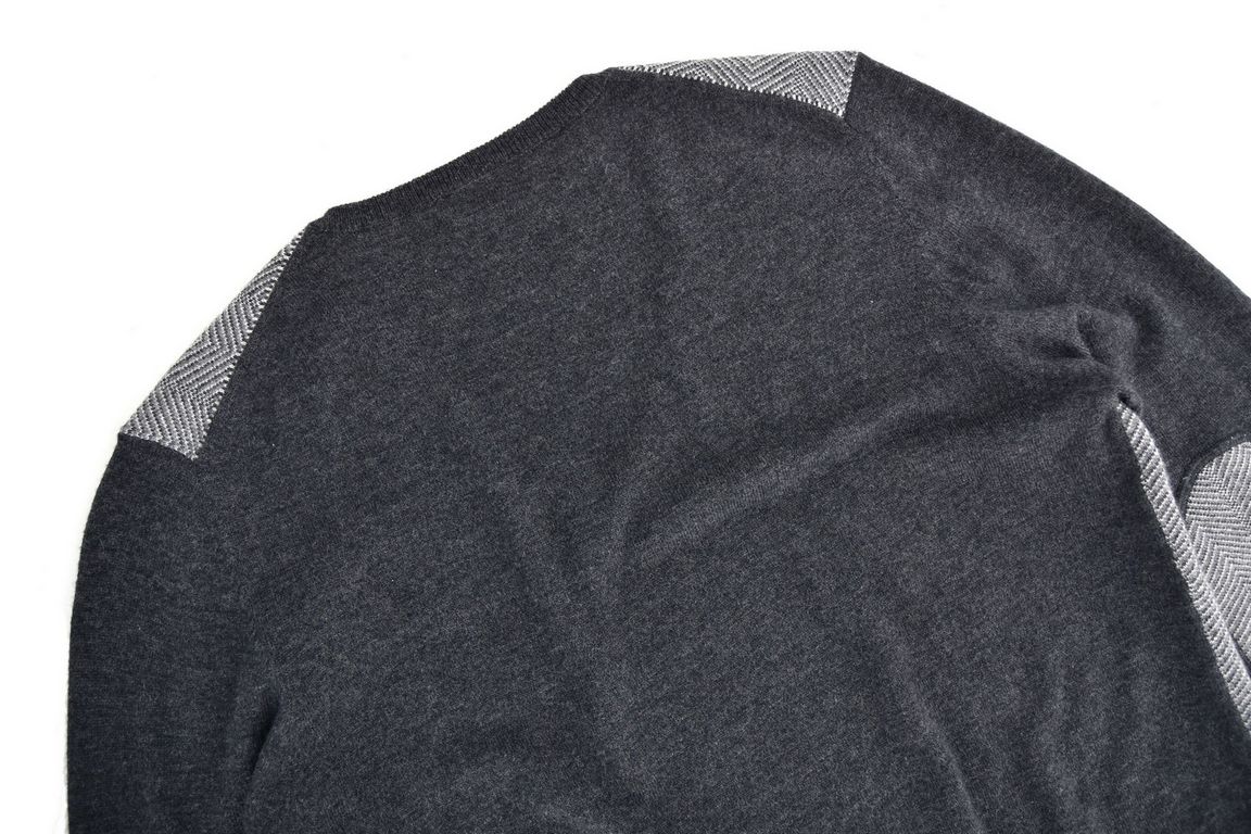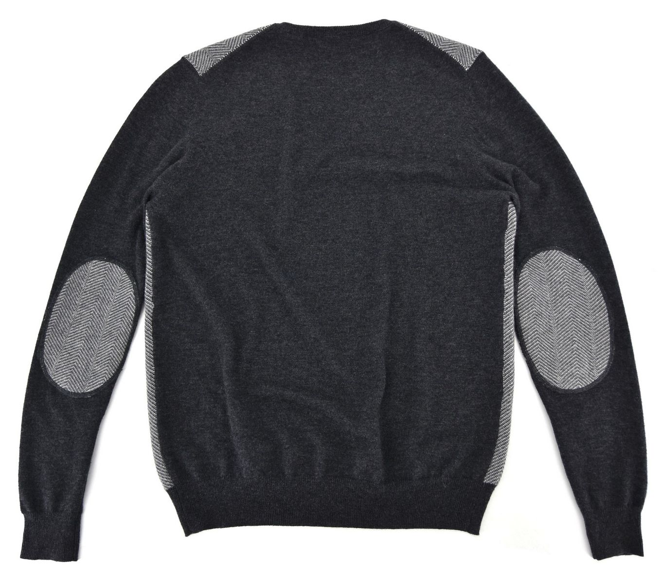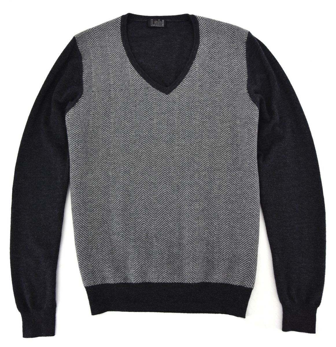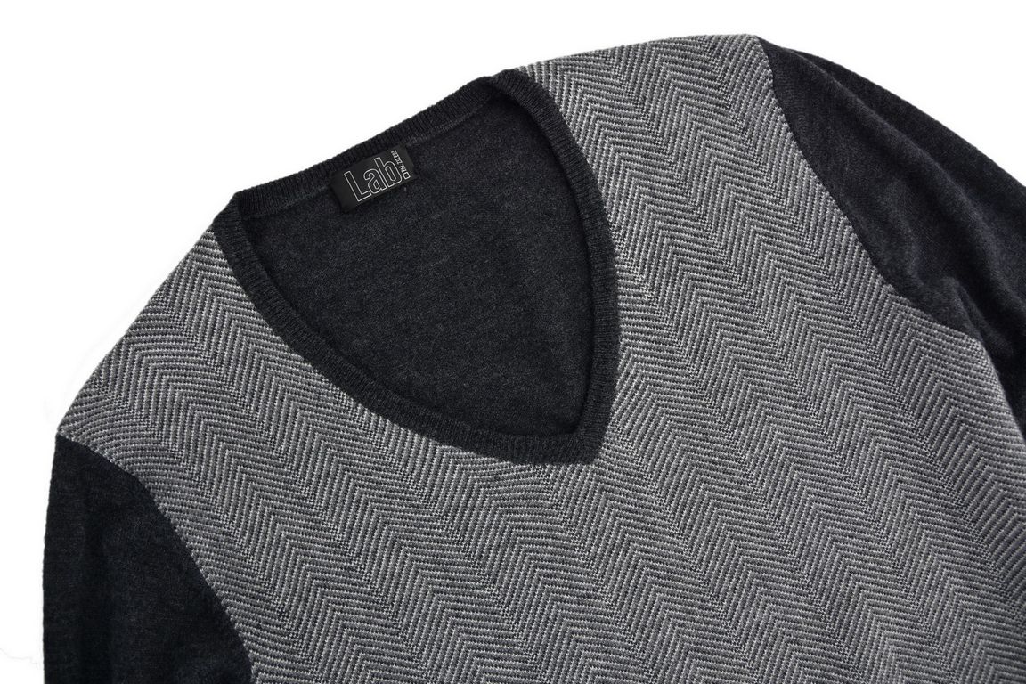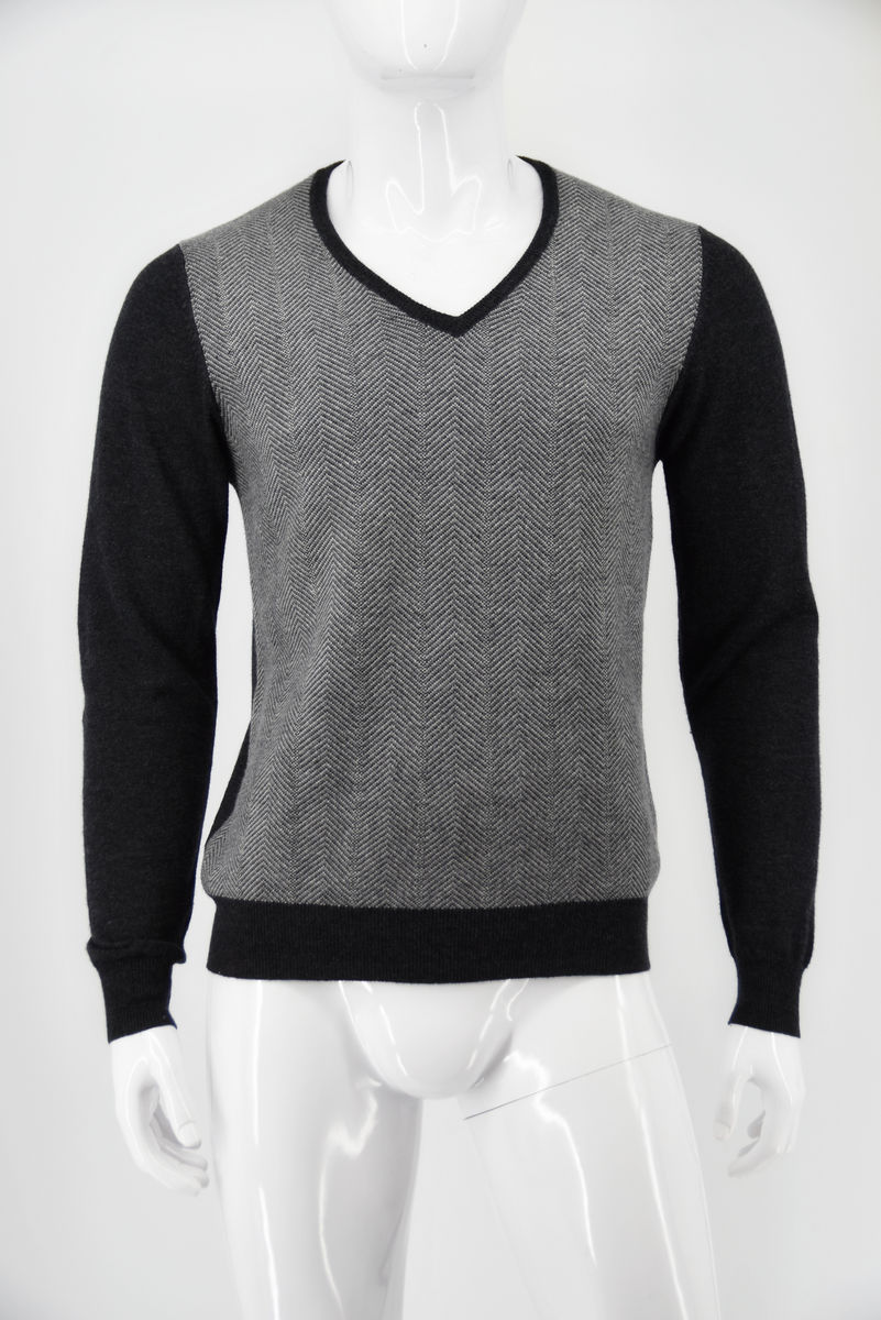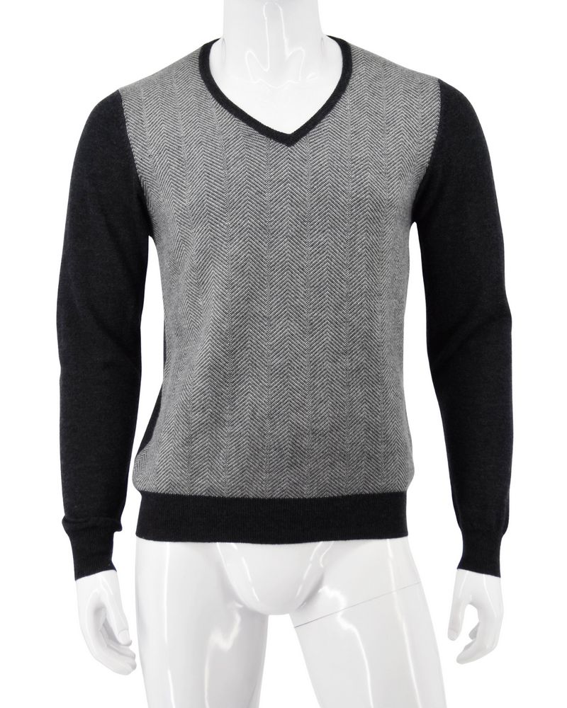 Unikatowy, elegancki męski sweter. Kolor szary, przód z wzorem w jodełkę. Dekolt w serek.