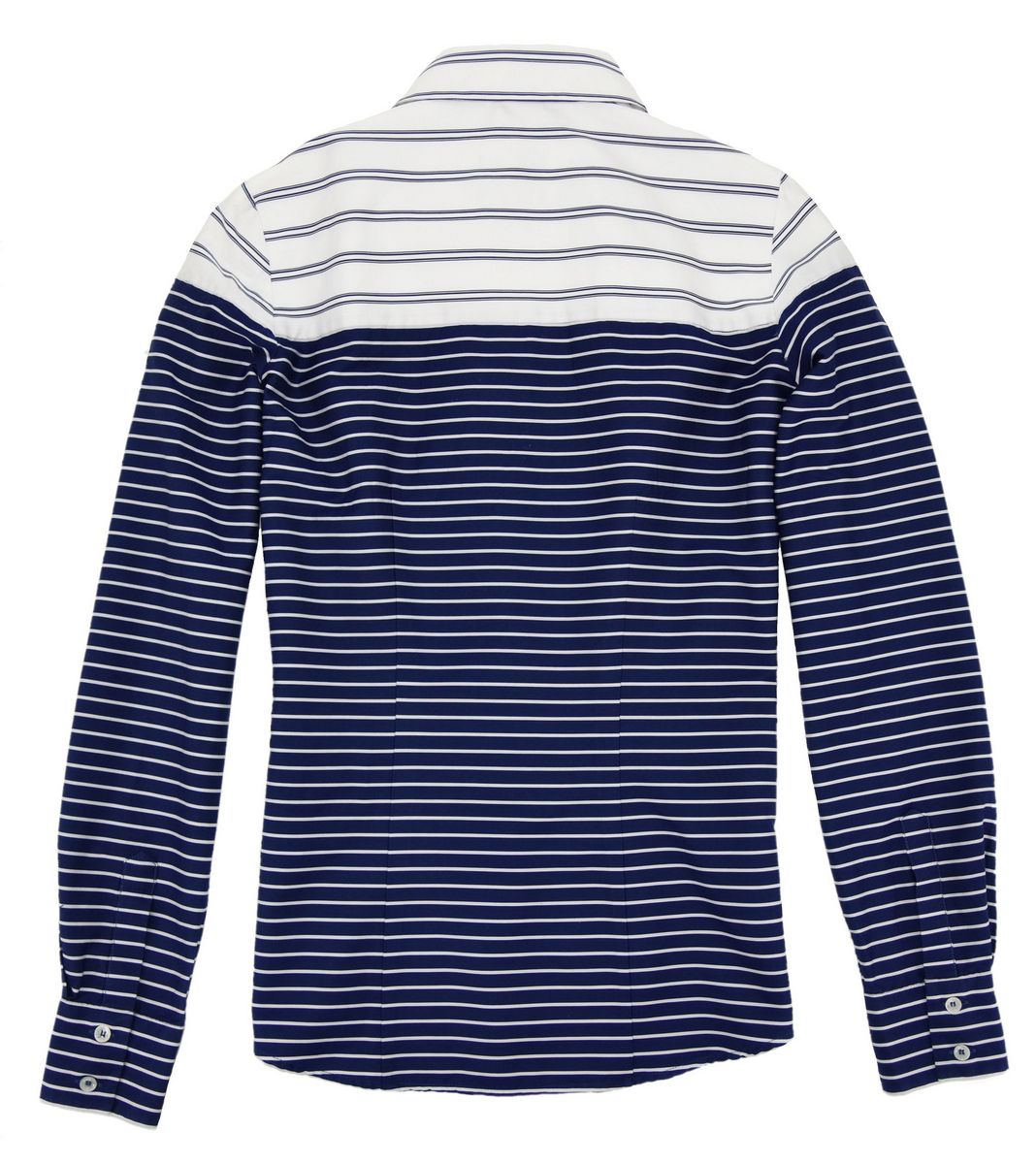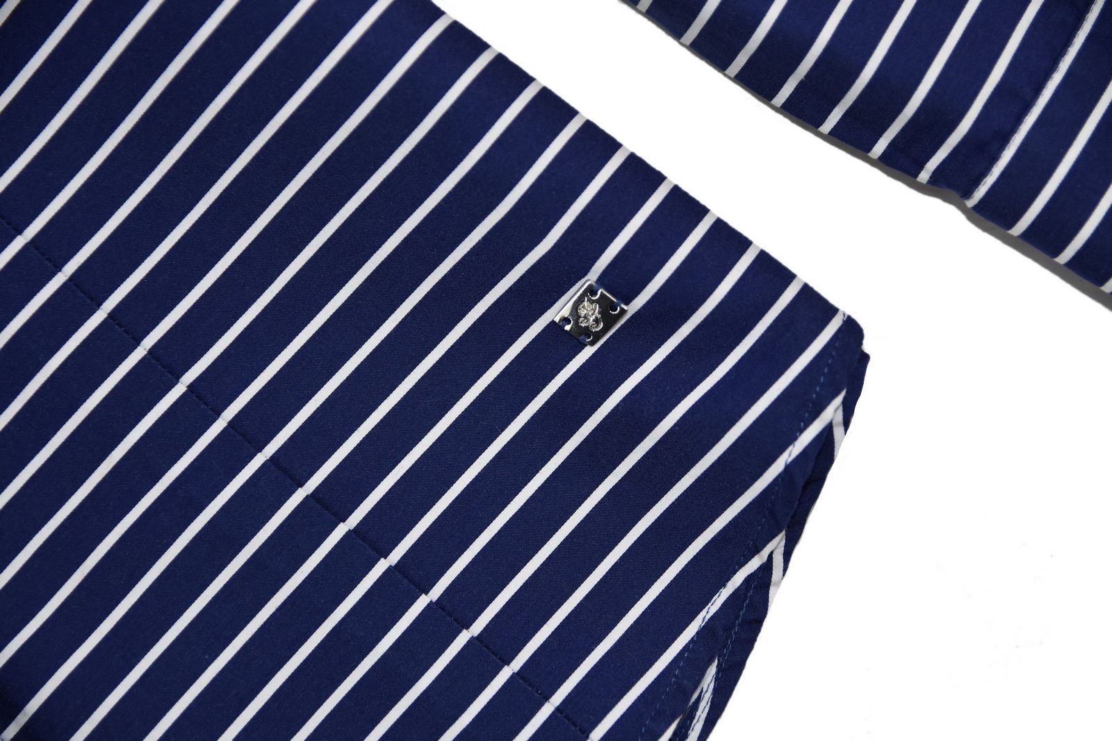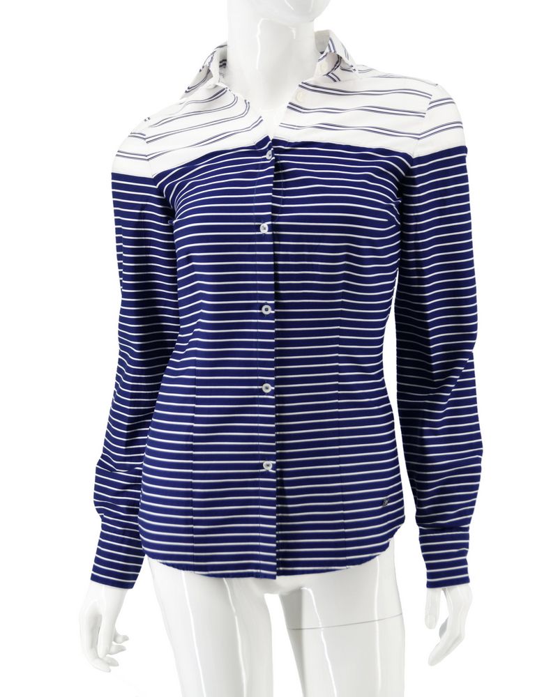 Odzież używana. Elegancka damska koszula z długim rękawem w granatowe paski. Wykonana z wysokiej jakości bawełny, idealna na wiele okazji