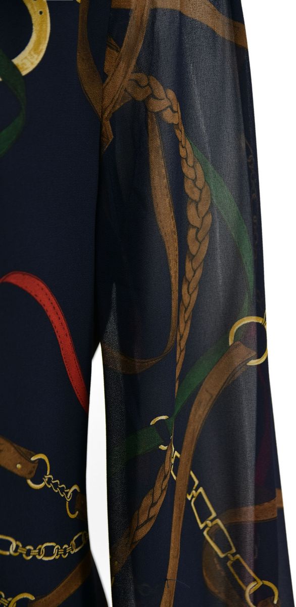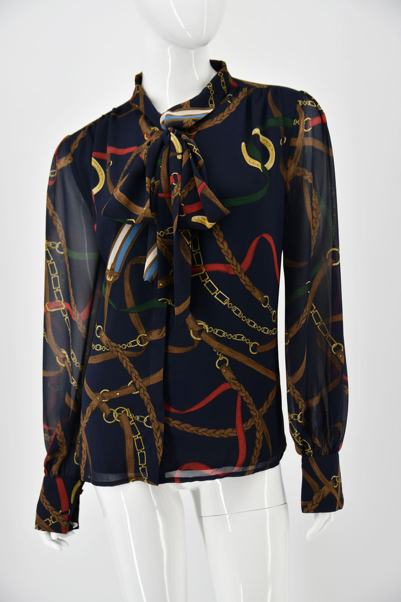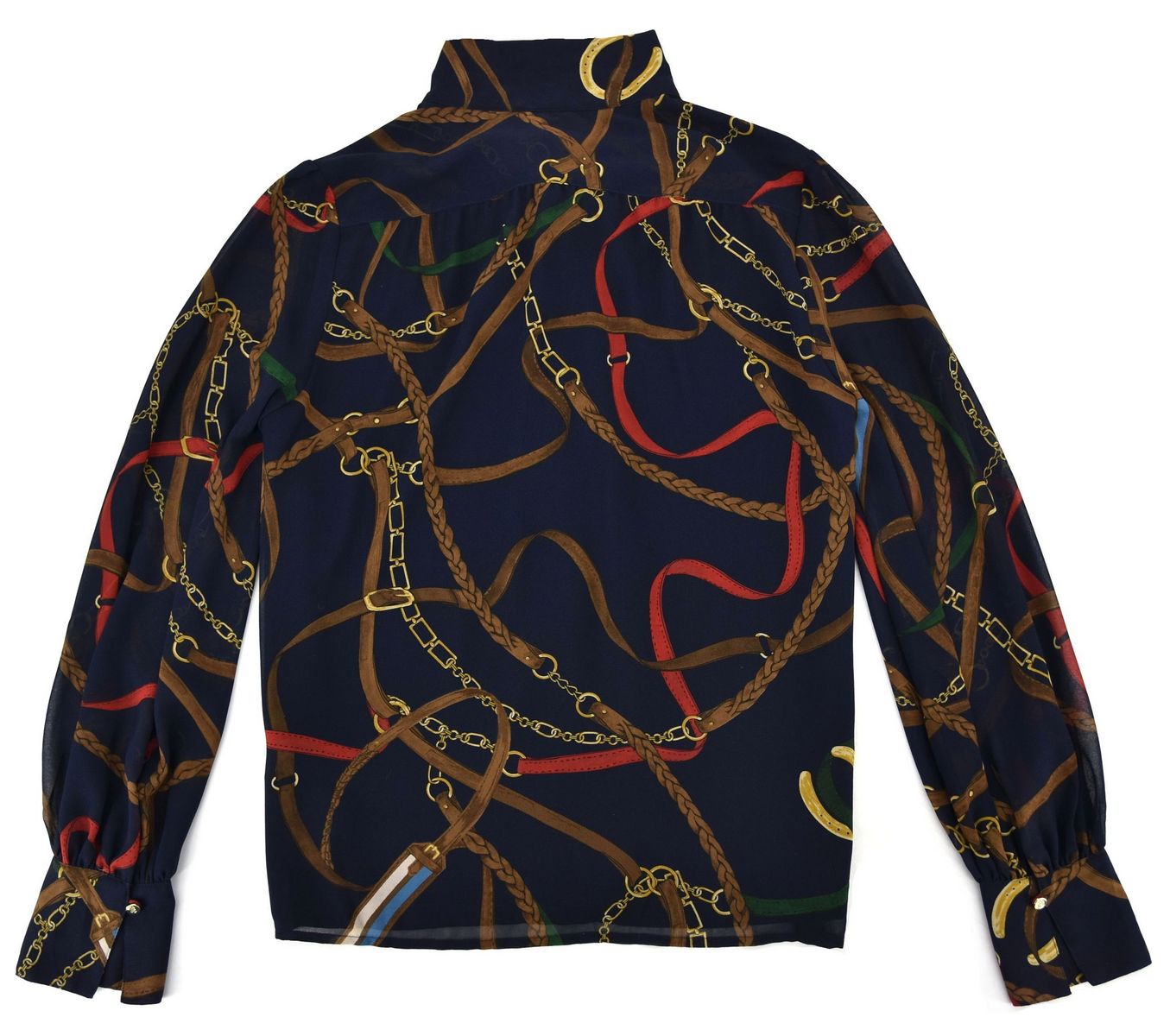 Cienka bluzka damska z jeździeckim motywem. Wiązana pod szyją. Miękka w dotyku. Wyjątkowa, bardzo kobieca, dla kobiet z klasą. Idealna na wiosnę i lato, do pracy lub na specjalne okazje.