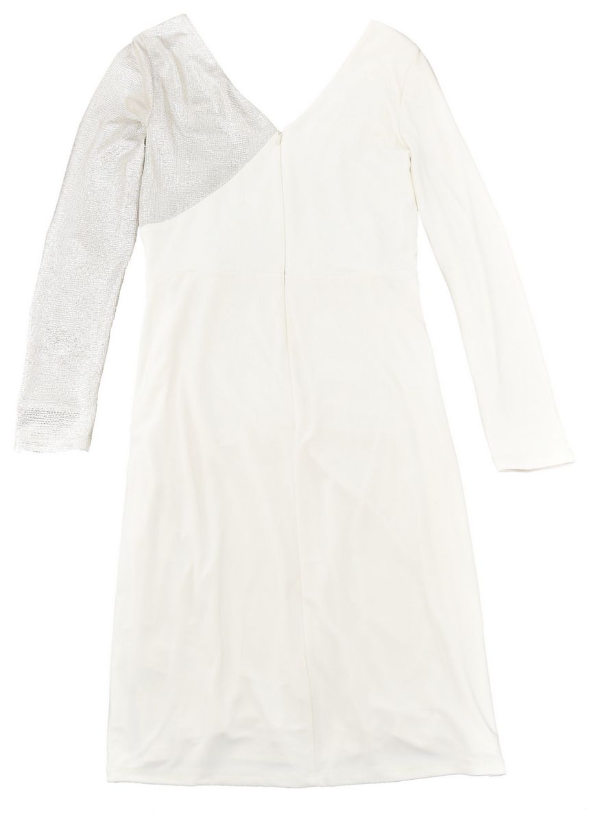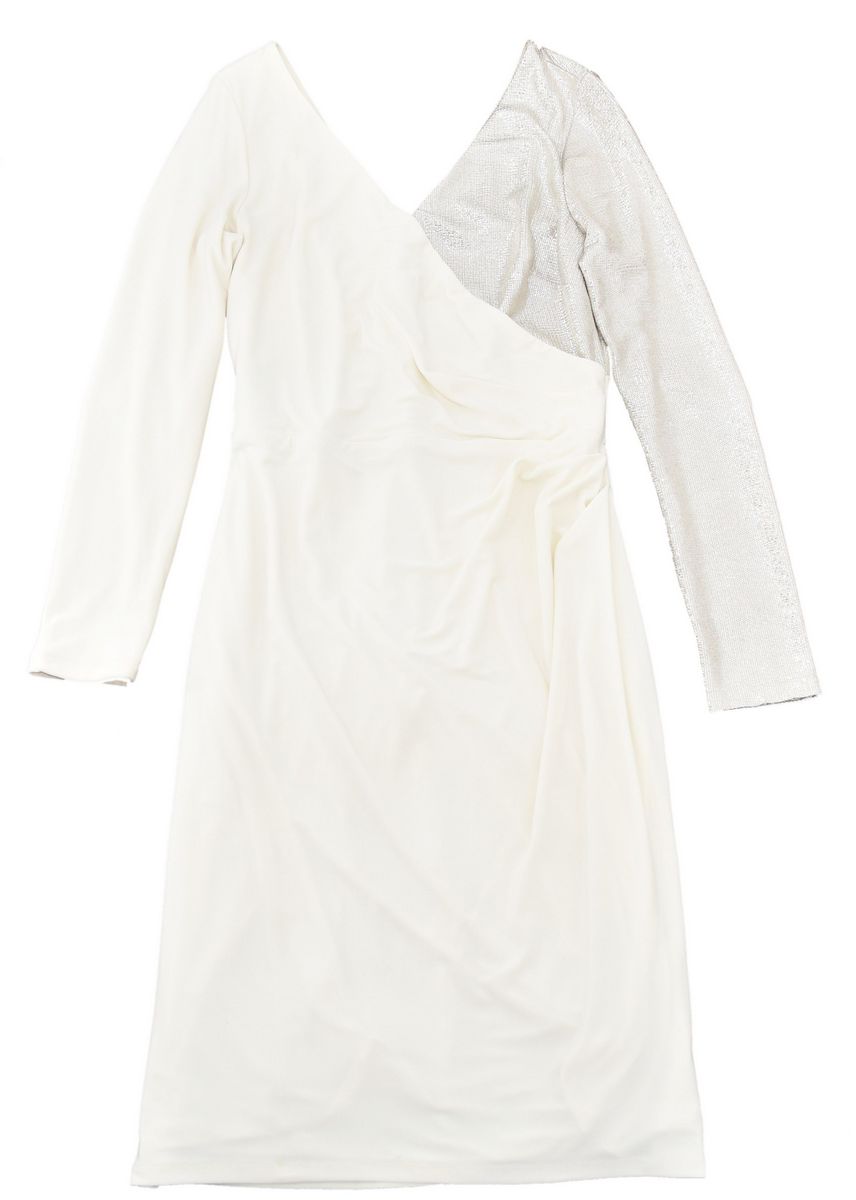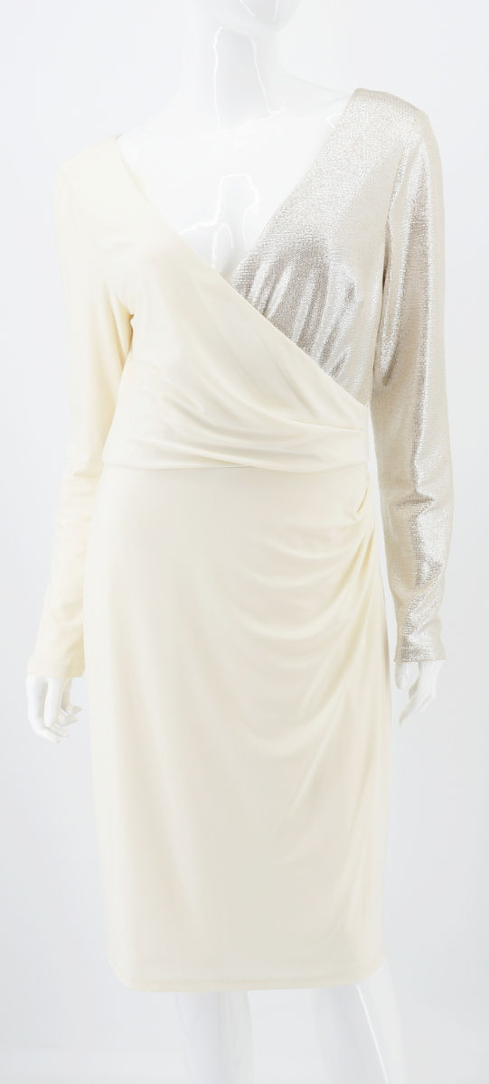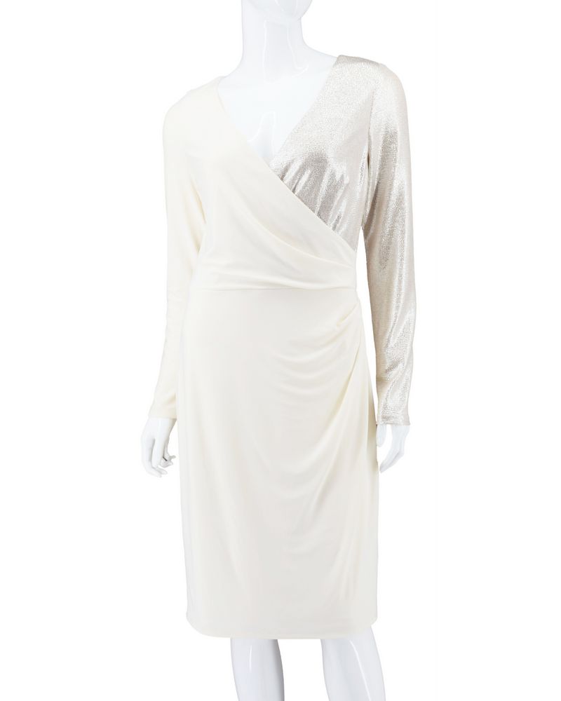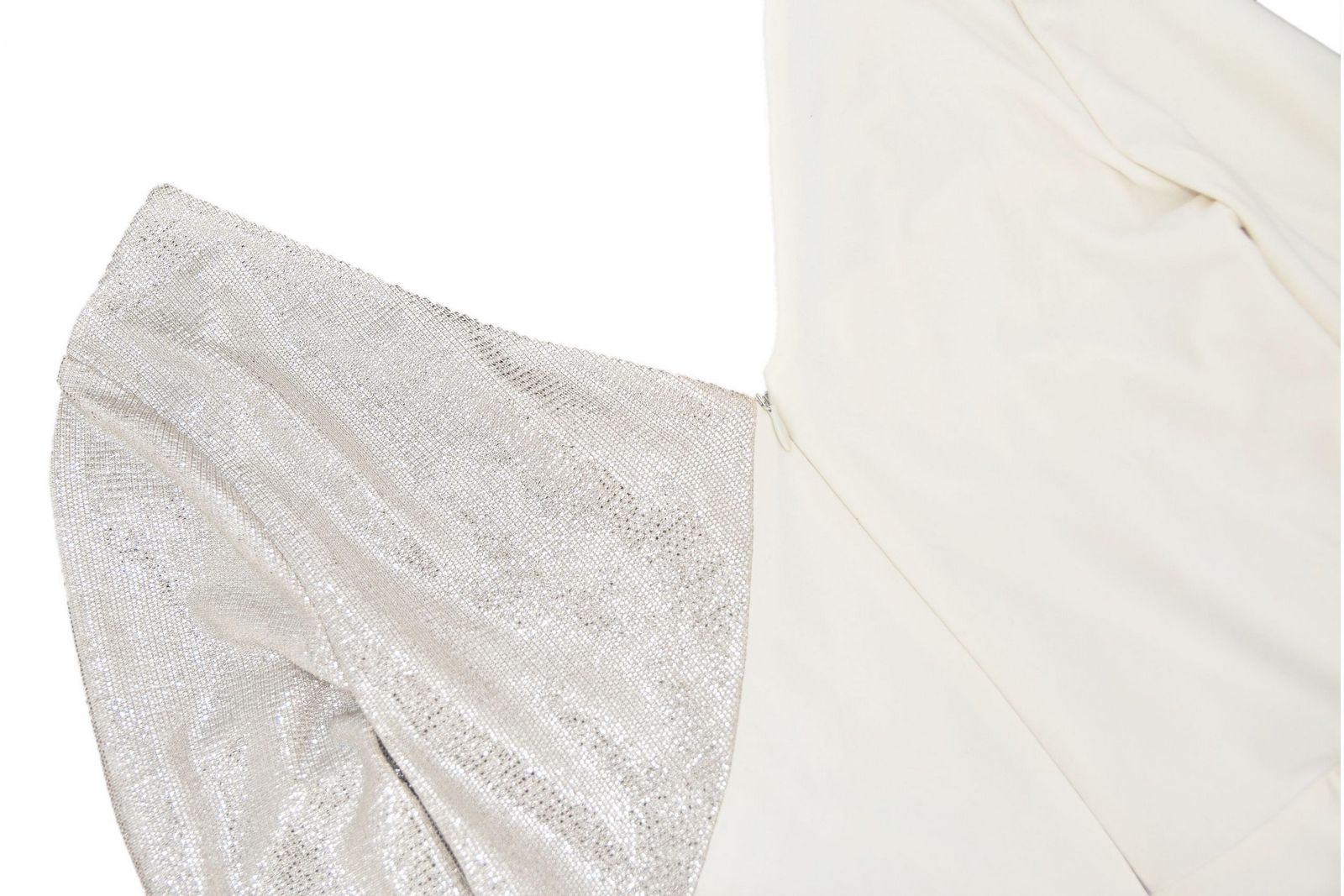 Przepiękna sukienka z długim rękawem w kolorze écru. Lewa górna strona przeplatana srebrną nitką. Krój prosty. Marszczona w talii. Głęboki dekolt w serek, lejący, tył w kształcie litery V. Wykonana z miłego w dotyku materiału, bardzo komfortowa w noszeniu
