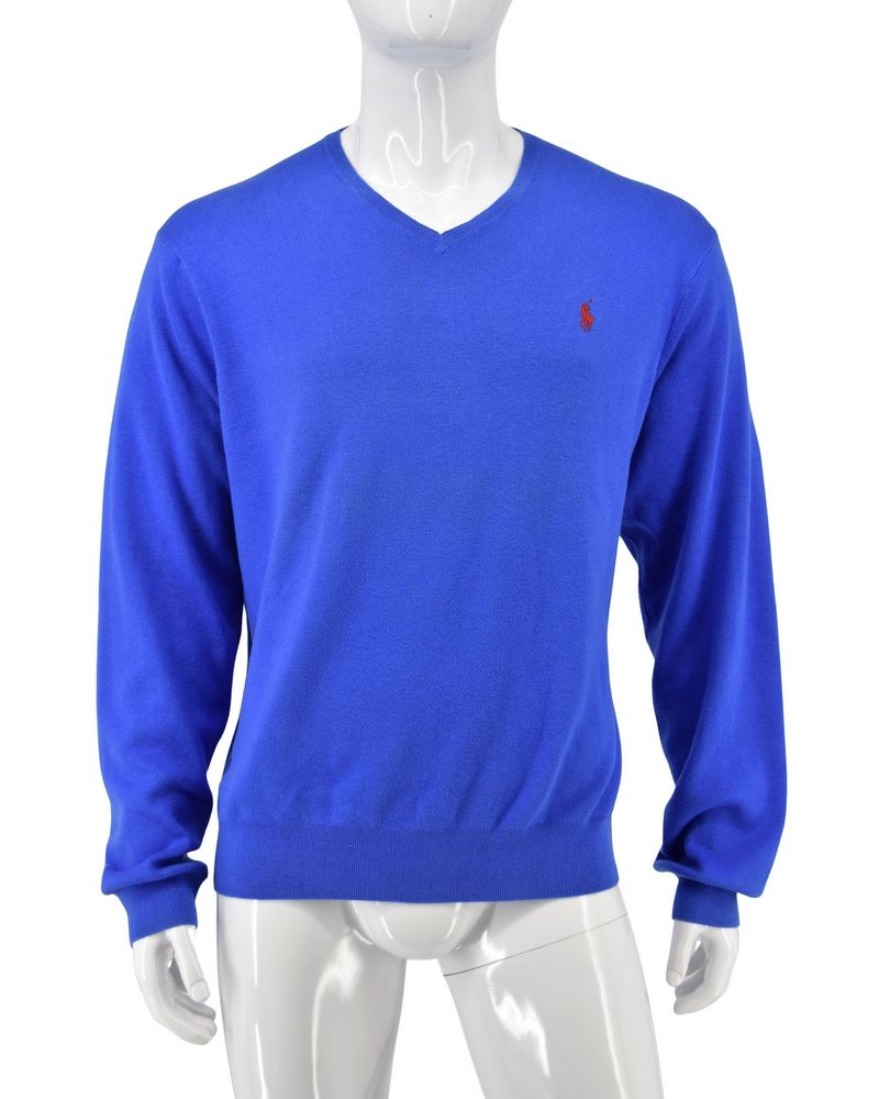 Sweter męski wykonany z bawełnianej dzianiny w kolorze niebieskim. Dekolt w serek. Rękawy i dolna krawędź wykończone elastycznym ściągaczem. Haftowany kucyk na lewej piersi. Wygodny, idealny do codziennych i eleganckich stylizacji.