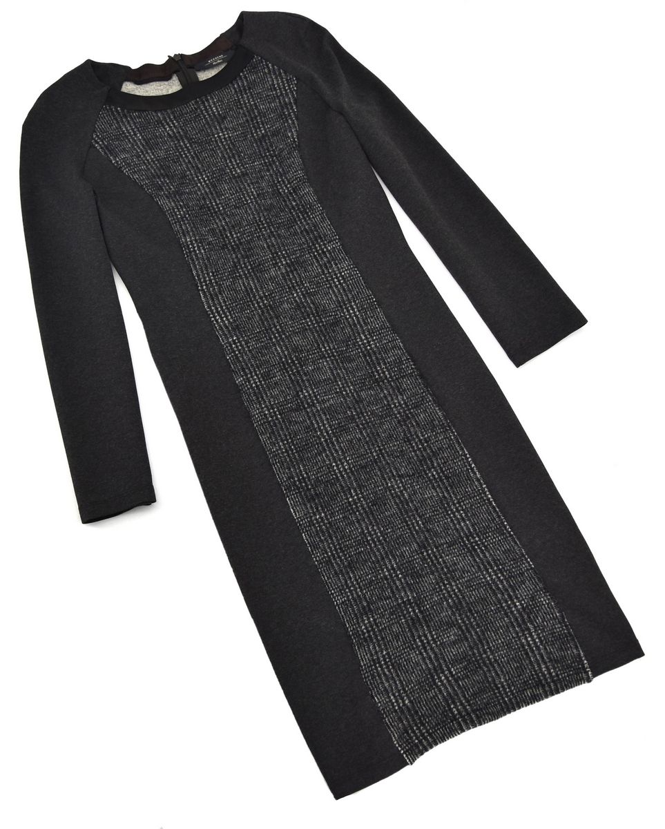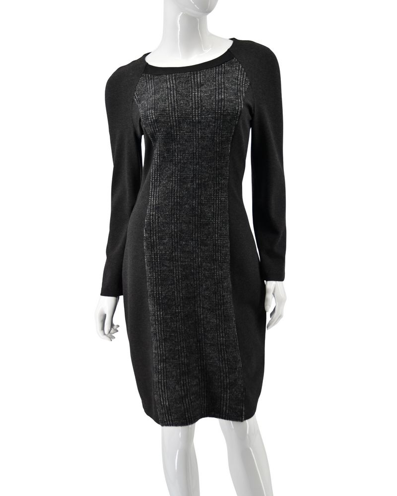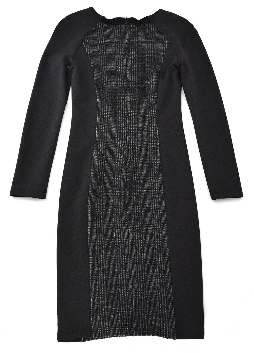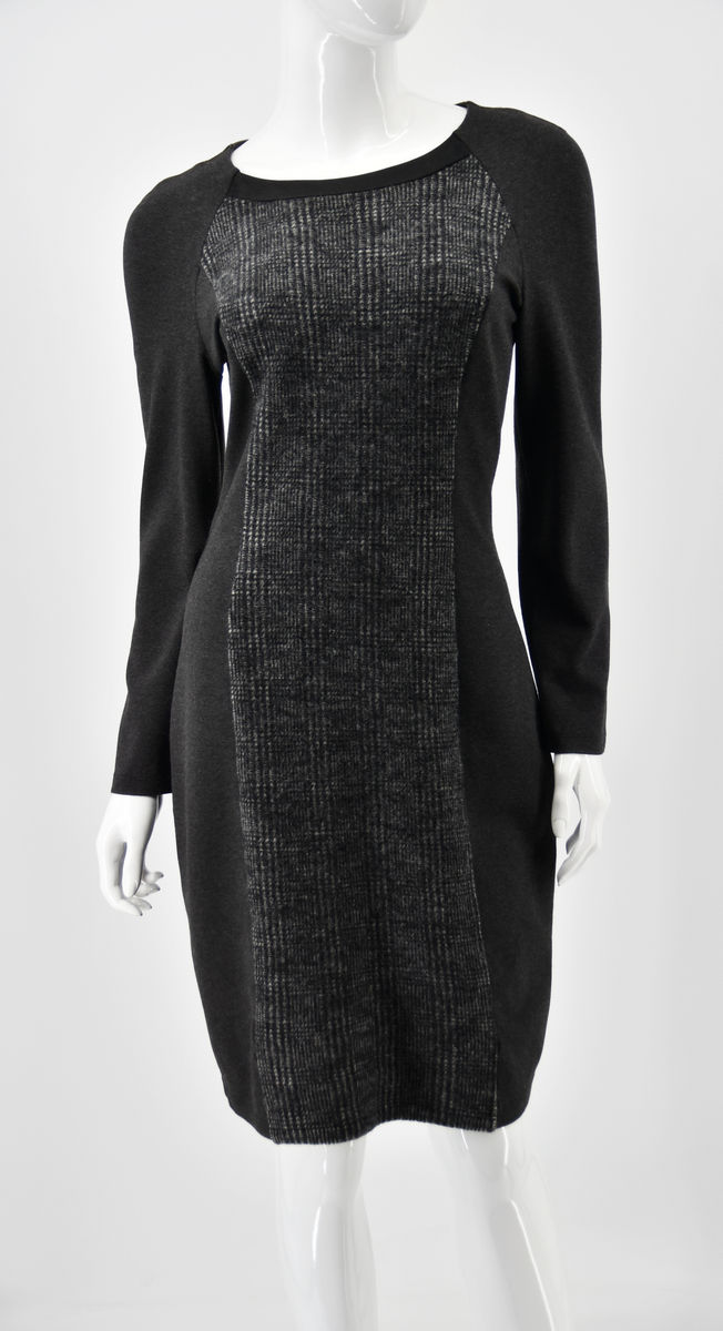 Wizytowa sukienka ołówkowa z długim rękawem, łącząca melanżową dzianinę z elastycznymi wstawkami z wiskozy. Elastyczna, dopasowuje się do sylwetki. Zapinana z tyłu na suwak. Idealna na jesień i zimę.